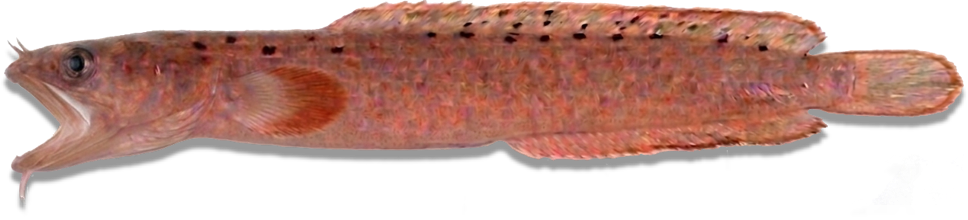 La comisura de la boca sobrepasa la vertical del borde posterior del ojo. Color marrón claro con zonas de tono salmón o rosáceo. Patrón de lunares oscuros que recorren el dorso junto a la base de la aleta dorsal, presentes o no en los flancos y sobre las aletas dorsal y caudal. La mitad distal de las aletas pectorales con un tono más intenso que el resto del cuerpo. Las aletas impares orladas también en un tono más oscuro.
