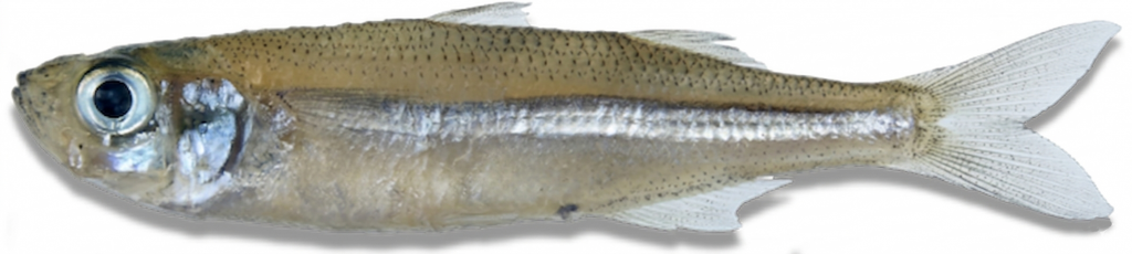Escamas lisas y relativamente grandes. La parte inferior de la cabeza, desde el mentón a la región yugular, es plana. Boca hendida en oblicuo y con maxilares protráctiles. Aleta ventral de base ancha. Dorso de color gris amarillento a marrón claro o con tonos verdosos, y profusamente cubierto de pequeños puntos negros. En los costados exhiben una franja longitudinal y plateada, con escamas ricas en cristales de guanina que reflejan un brillo intenso.